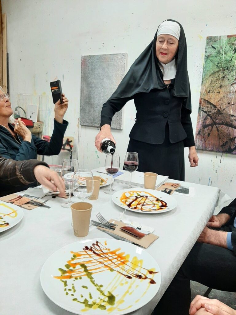 “Wat een rijkdom, wat een veelheid. Rijk aan taal en beeld en mystiek en materie en drank en spijs. Veel mensen, indrukken, locaties (en dat op één plek) smaaksensaties, kleuren, poëzie en beelden. En dat alles losjes bijeengehouden door de beide presenterende nonnen. Heetten ze nou Non Deju en Non Descript, of was het toch Bernadette en Godelieve? Het doet er niet toe. De lichte sprankelende toets waarmee Tet en Mieke de culinair smaakvolle en verrassende gerechten van Niko aaneenrijgen met dat wat de kunstenaars uit de verschillende ateliers ons tonen (op dan weer subtiele, dan weer uitgesproken wijze) is simpelweg een feest, ik kan niet anders zeggen. En dat je onderwijl nog tijd hebt voor kleine nieuwe ontmoetingen is extra leuk. Het komt vanuit een gedachte: vermaak en kwaliteit. Ze gaan hand in hand.”